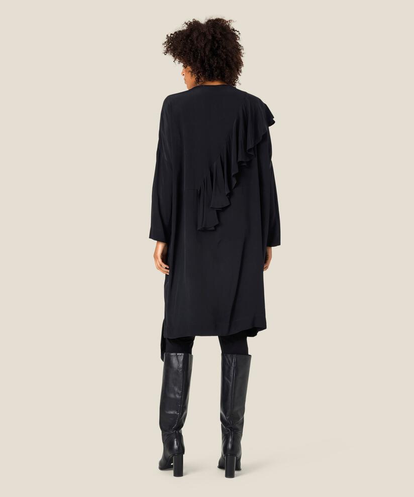 Framhäv din inre señorita med denna vackra volangklänning. Den mjuka viskosen har ett löst och avslappnat snitt som gör den skön att ha på sig. Klänningen är designad med en dekorativ volang som går upp över ena axeln och skapar massor av liv när du rör dig. I övrigt har den ett enkelt uttryck med rund halsringning, långa ärmar och en fin längd som slutar strax under knät. Använd den som den är och låt den fina volangdetaljen stå för uppmärksamheten.