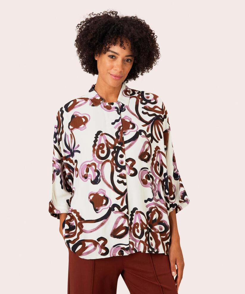 Allting ligger i detaljerna – och på denna sprudlande skjorta finns det massor av dem. Skjortan är designad med ett sirligt handritat mönster, dold knäppning och vida fladdermusärmar. Det avslappnade snittet ger den ett löst och fint fall och stor rörelsefrihet. Den är mjuk, lös och luftig och fungerar lika bra till smala som vidare byxor, en kjol eller leggings – utgå helt enkelt från vad du känner för.